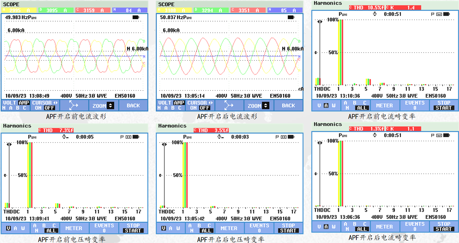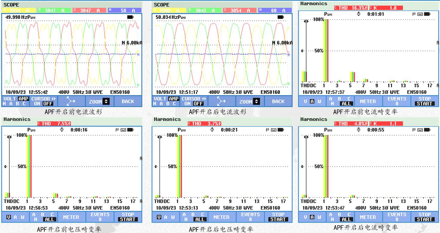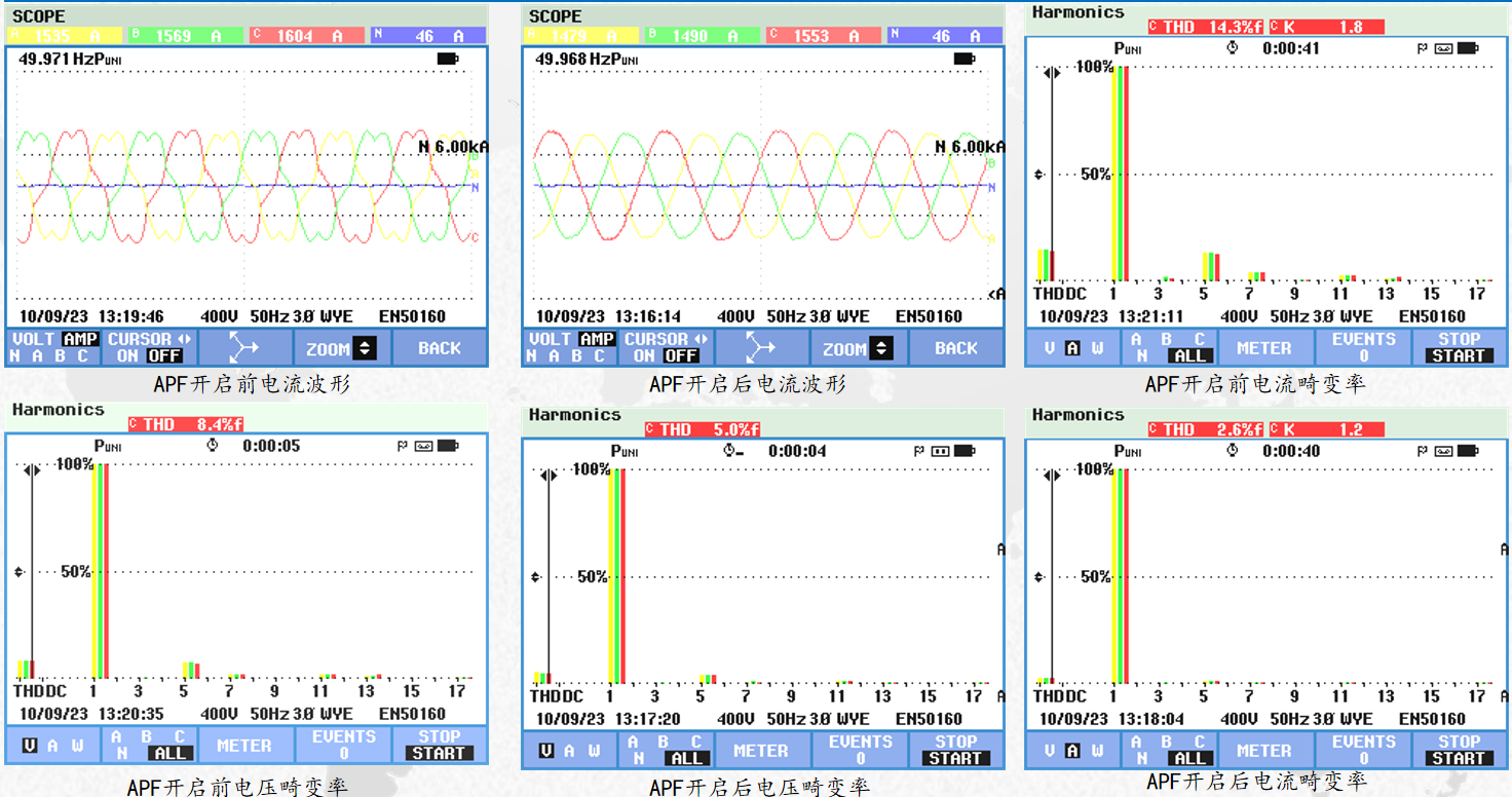 南京燦能電力自動(dòng)化股份有限公司對(duì)該公司3臺(tái)配變低壓側(cè)進(jìn)行了諧波測(cè)試,根據(jù)測(cè)試數(shù)據(jù)制定了諧波治理方案,在3臺(tái)配變低壓側(cè)總計(jì)安裝1600A有源電力濾波器APF。