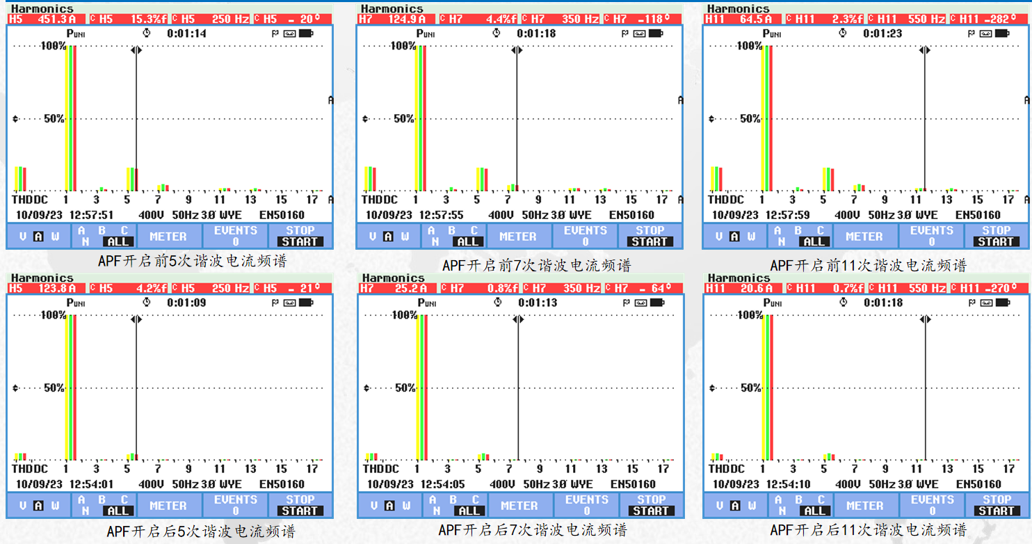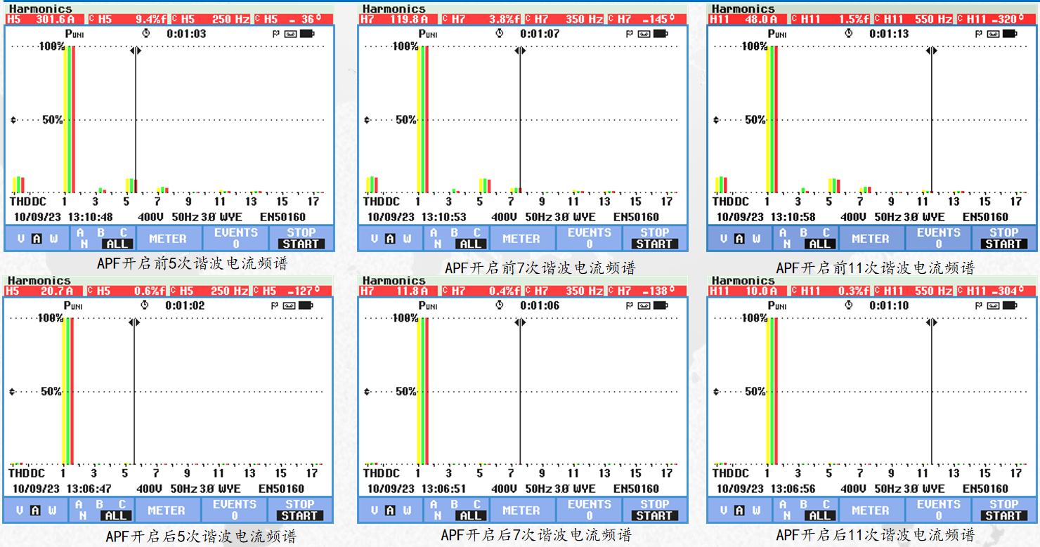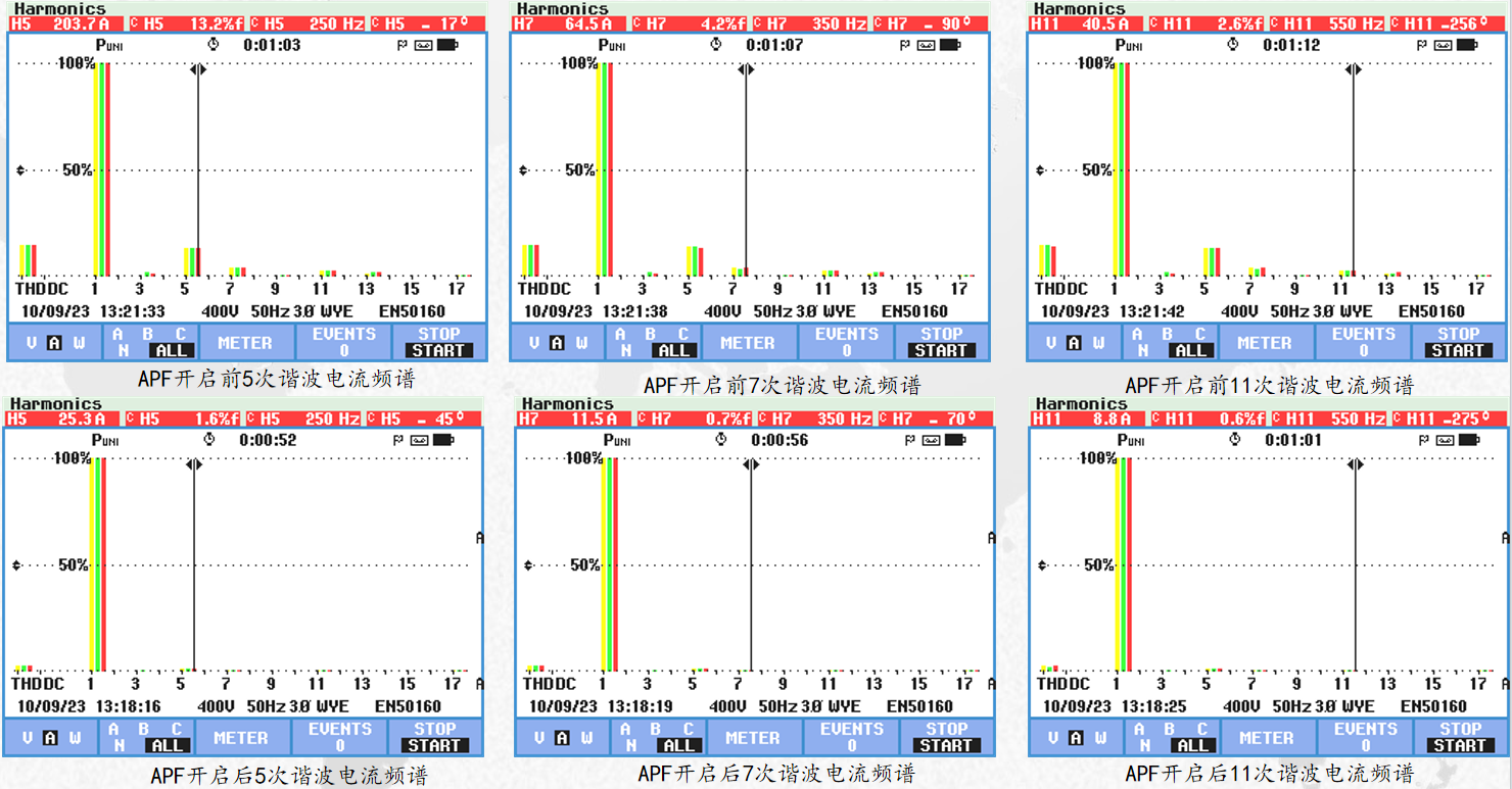 1#變壓器APF運(yùn)行后可以看出,諧波電壓總畸變率從7.5%降至3.7%,諧波電流總畸變率從16.3%降至4.0%,5次諧波電流畸變率由15.3%濾除至4.2%,7次諧波電流畸變率由4.4%濾除至0.8%,11次諧波電流畸變率由2.3%濾除至0.7%。